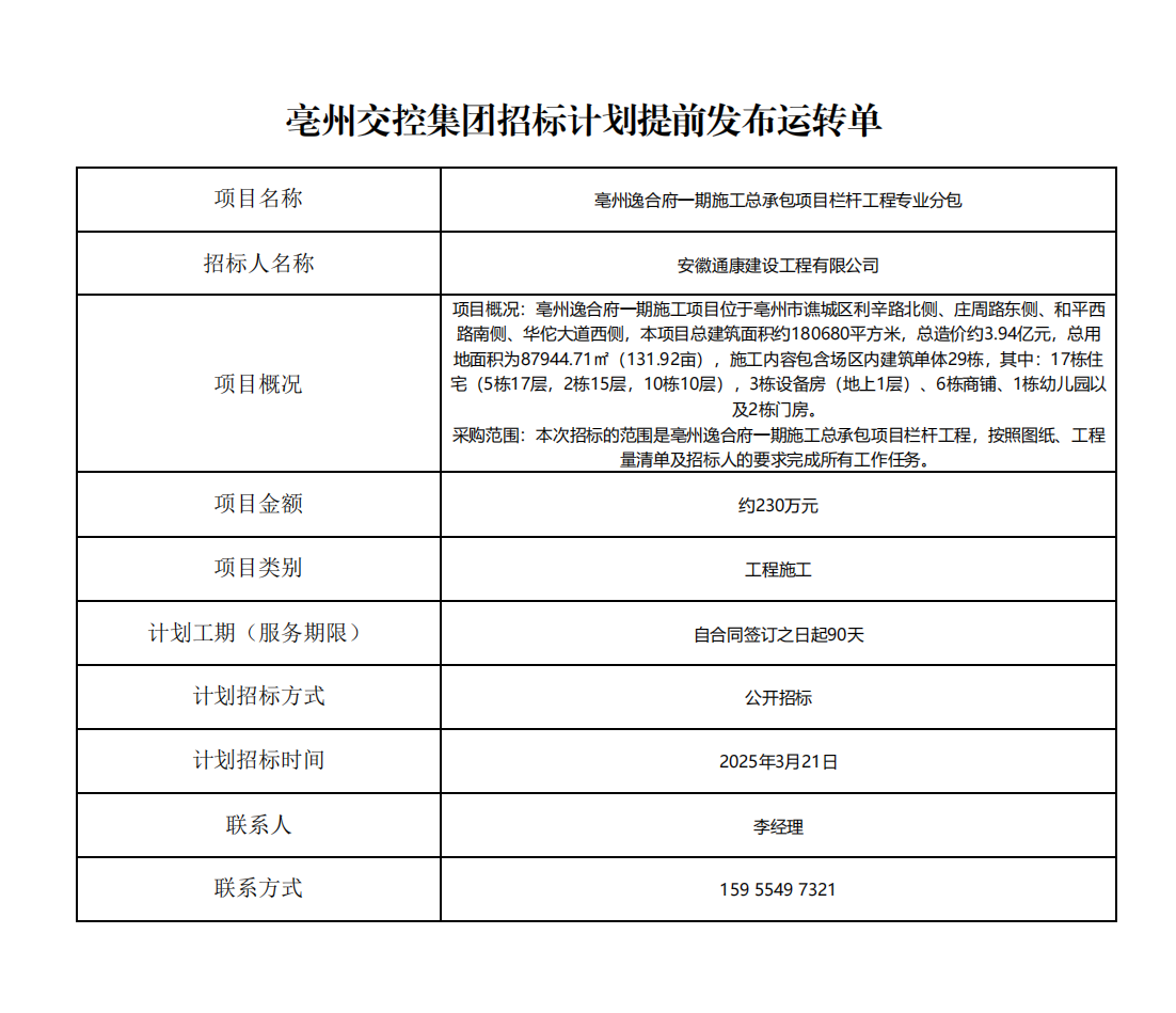 亳州逸合府一期施工總承包項(xiàng)目欄桿工程專業(yè)分包招標(biāo)計(jì)劃