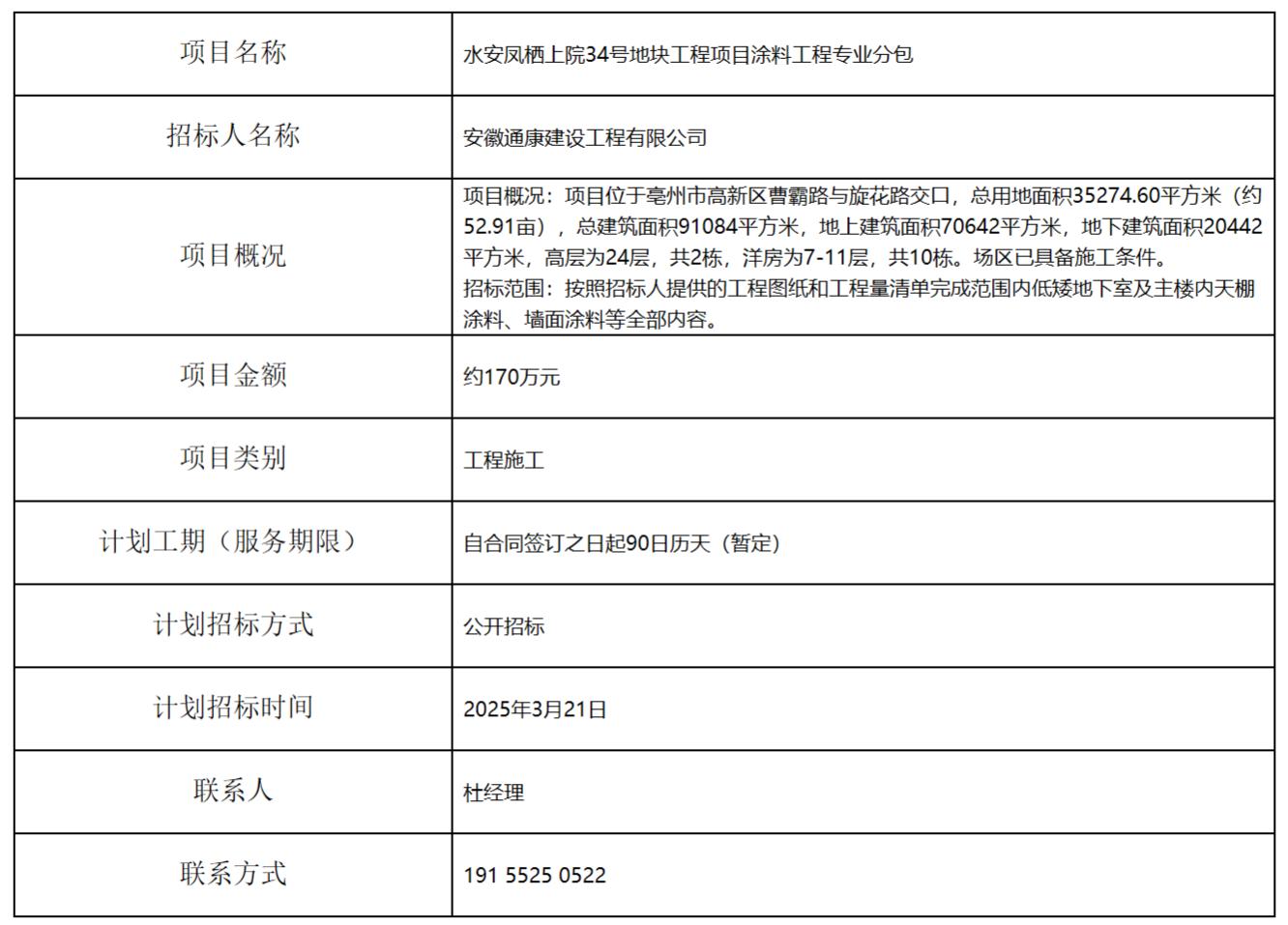 水安鳳棲上院34號地塊工程項目涂料工程專業(yè)分包招標(biāo)計劃