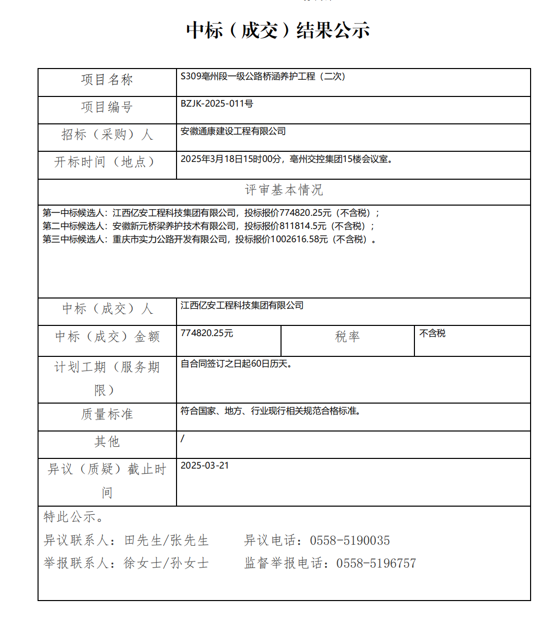 S309亳州段一級(jí)公路橋涵養(yǎng)護(hù)工程(二次)中標(biāo)(成交)結(jié)果公示