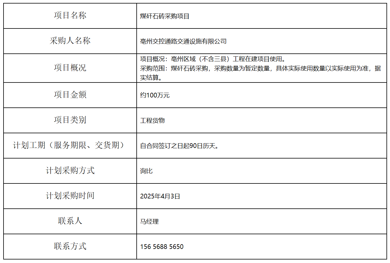 煤矸石磚采購項(xiàng)目采購計(jì)劃