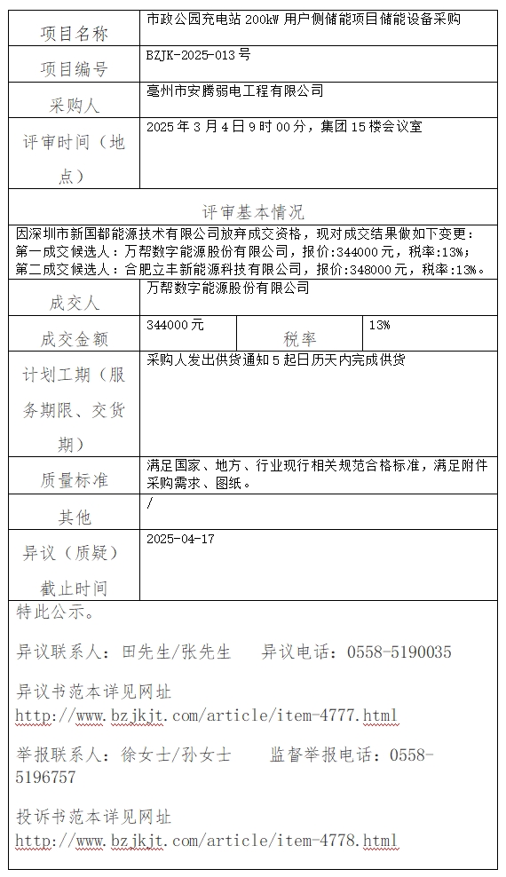 市政公園充電站200kW用戶側(cè)儲能項目儲能設(shè)備采購成交結(jié)果變更公示