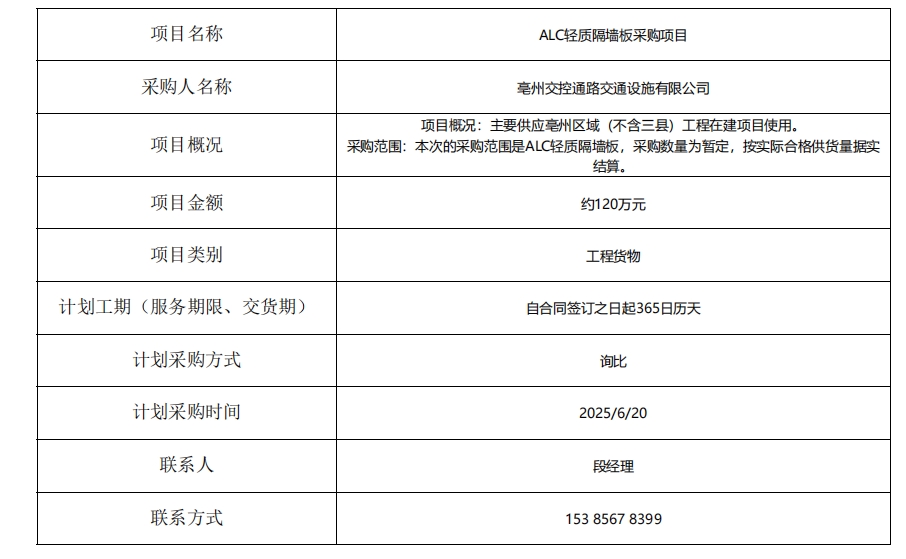 ALC輕質(zhì)隔墻板采購項(xiàng)目采購計(jì)劃