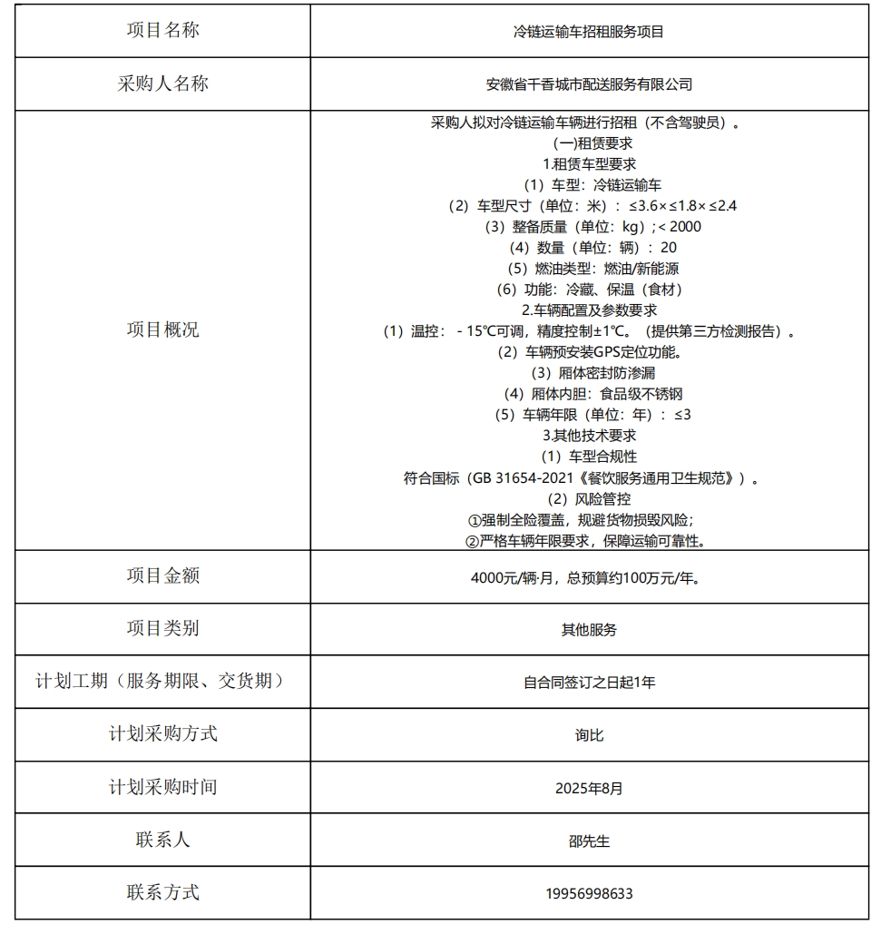 冷鏈運(yùn)輸車招租服務(wù)項(xiàng)目采購(gòu)計(jì)劃