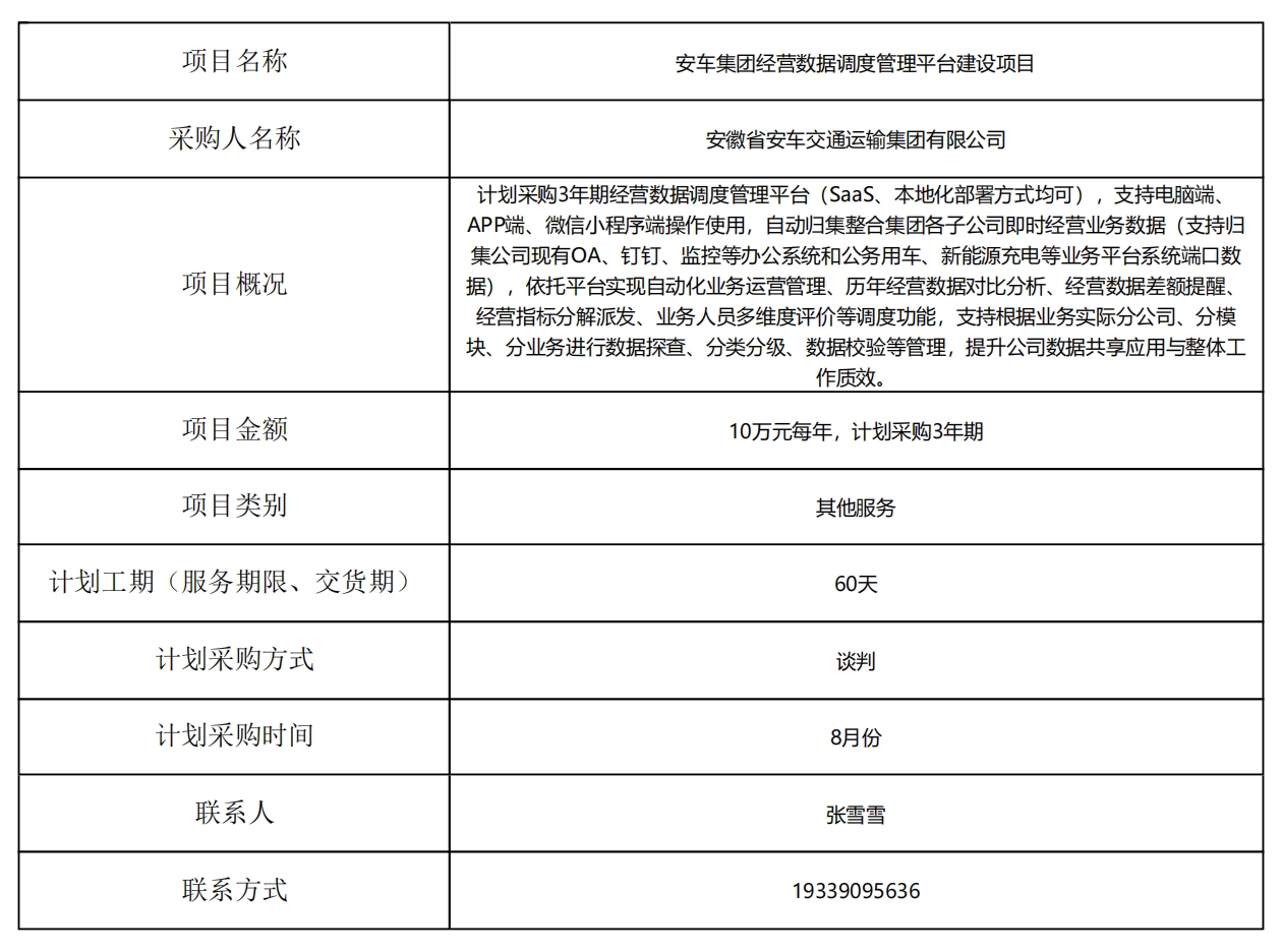 安車集團(tuán)經(jīng)營數(shù)據(jù)調(diào)度管理平臺(tái)建設(shè)項(xiàng)目招標(biāo)計(jì)劃