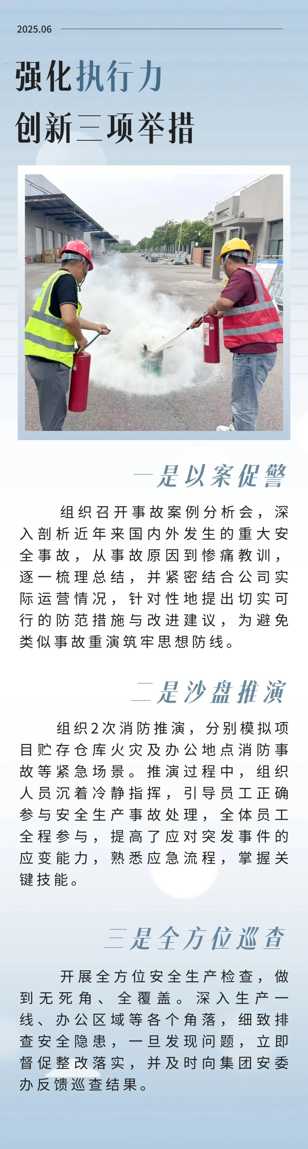 下一步,公司將持續(xù)發(fā)力,培育獨具特色的安全文化氛圍,讓安全理念融入企業(yè)血脈,時刻繃緊安全弦,嚴格遵守安全規(guī)定,確保安全生產(chǎn)工作常態(tài)化、長效化開展,為公司高質(zhì)量、可持續(xù)發(fā)展提供堅實有力的安全保障。