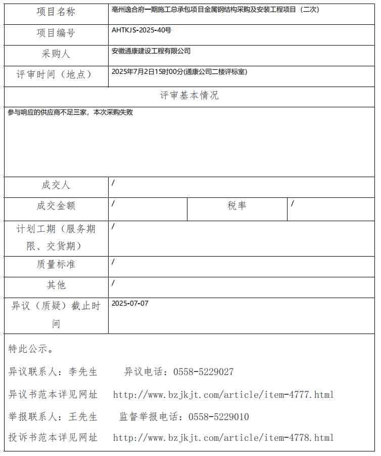 亳州逸合府一期施工總承包項目金屬鋼結(jié)構(gòu)采購及安裝工程項目(二次)成交結(jié)果公示