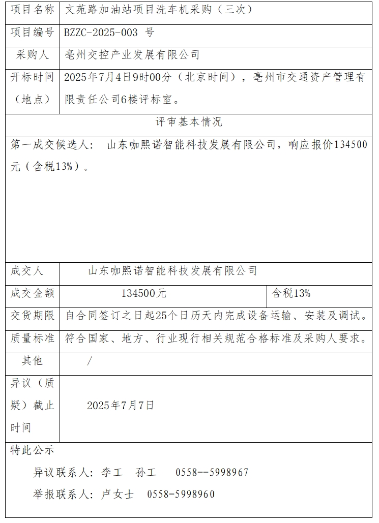 文苑路加油站項(xiàng)目洗車(chē)機(jī)采購(gòu)(三次)成交結(jié)果公示