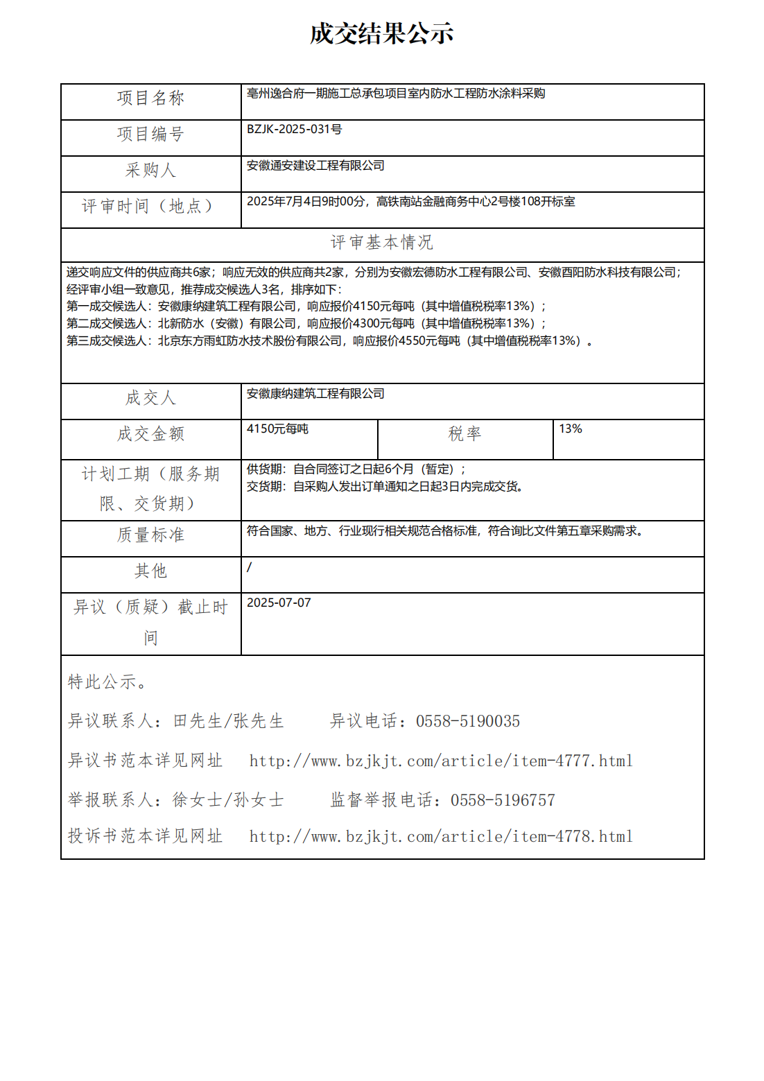 亳州逸合府一期施工總承包項(xiàng)目室內(nèi)防水工程防水涂料采購成交結(jié)果公示