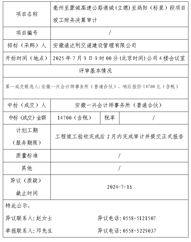 亳州至蒙城高速公路譙城(立德)至渦陽(標里)段項目竣工財務決算審計中標(成交)結果公示