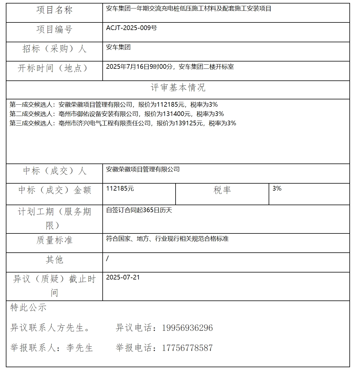 安車集團(tuán)一年期交流充電樁低壓施工材料及配套施工安裝項(xiàng)目中標(biāo)(成交)結(jié)果公示