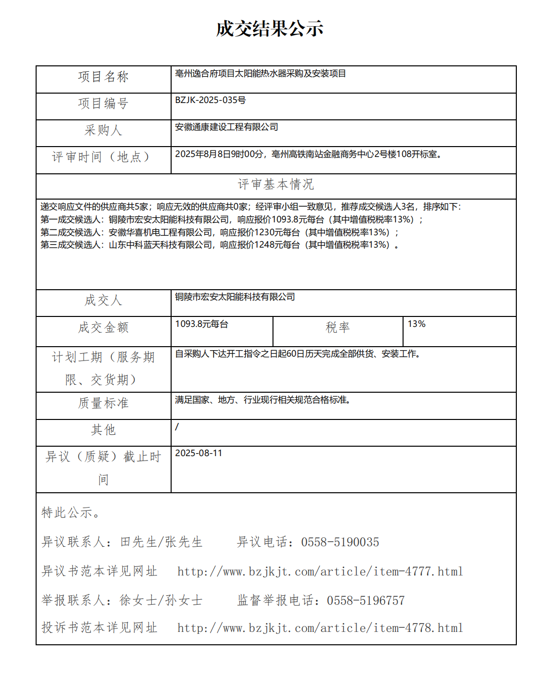 亳州逸合府項(xiàng)目太陽能熱水器采購及安裝項(xiàng)目成交結(jié)果公示