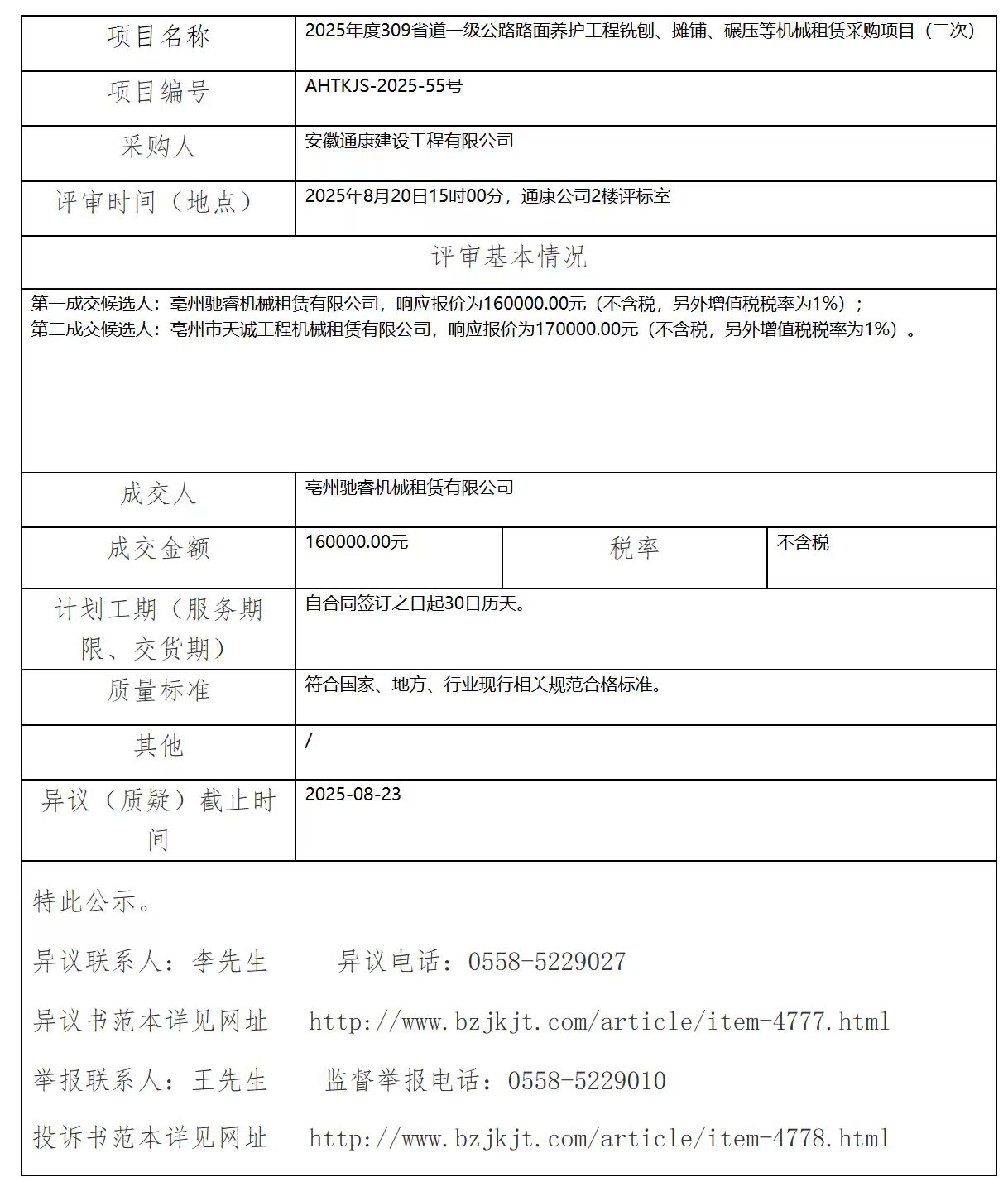 2025年度309省道一級公路路面養(yǎng)護工程銑刨、攤鋪、碾壓等機械租賃采購項目(二次)成交結(jié)果公示