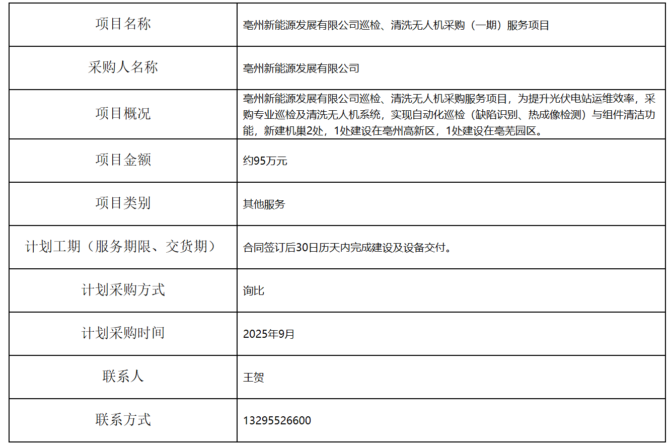 亳州新能源發(fā)展有限公司巡檢、清洗無(wú)人機(jī)采購(gòu)(一期)服務(wù)項(xiàng)目招標(biāo)計(jì)劃