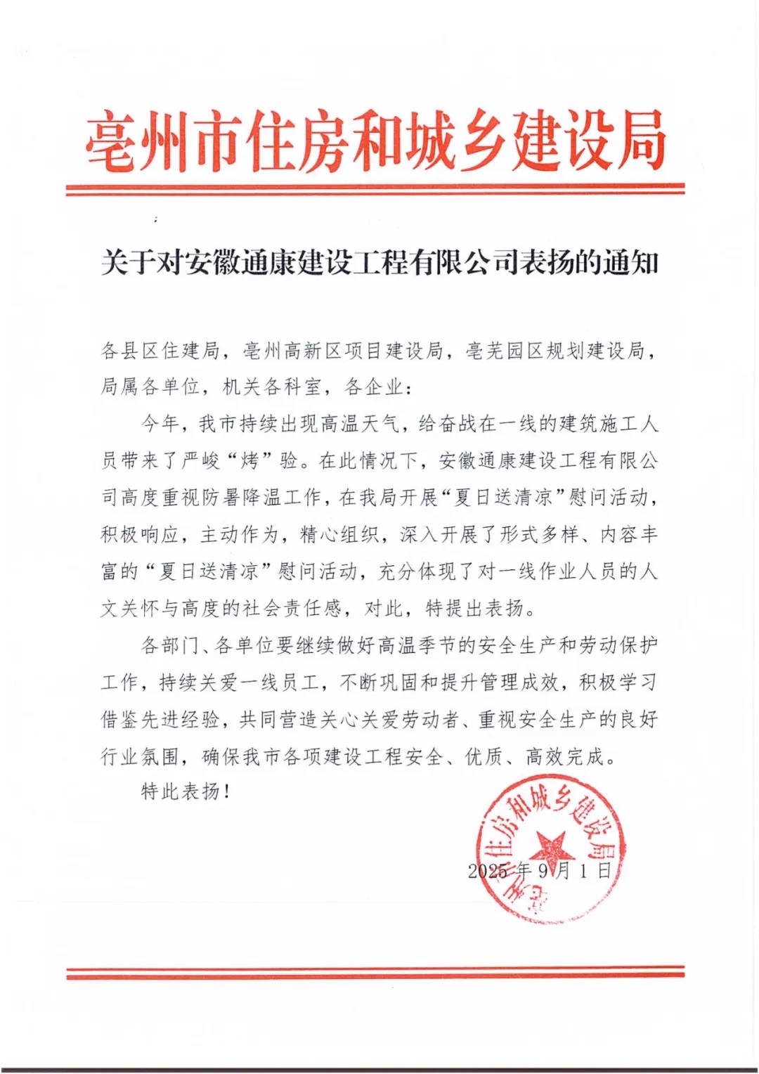 近日,通康公司收到了亳州市住房和城鄉(xiāng)建設(shè)局發(fā)來的表揚(yáng)文件,文件對(duì)通康公司在防暑降溫、安全生產(chǎn)、保障勞動(dòng)者安全健康等方面表示了充分肯定,為全市建筑行業(yè)樹立了優(yōu)秀典范。