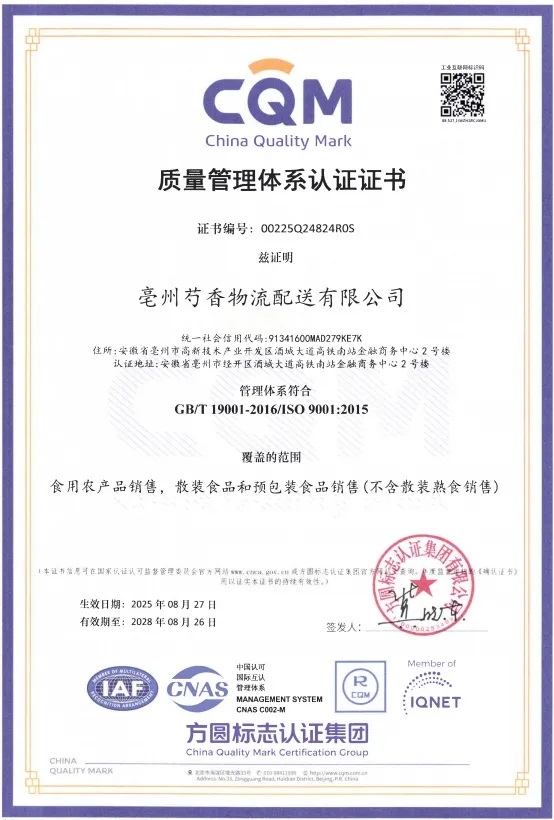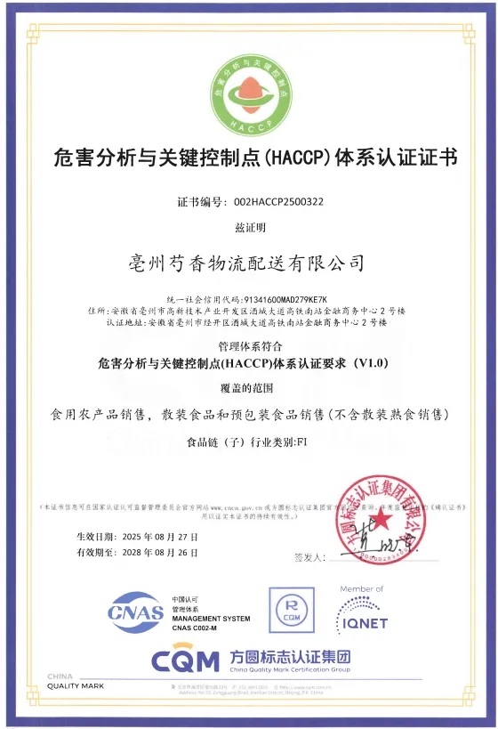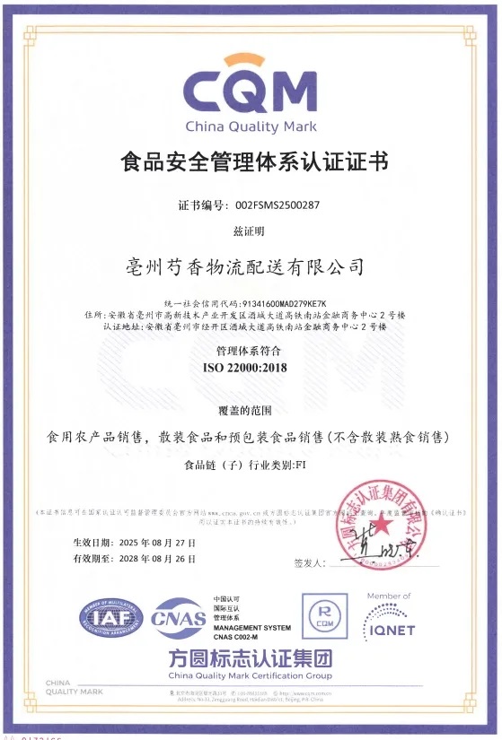 近日,亳州芍香物流配送有限公司成功通過ISO9001質(zhì)量管理體系、ISO22000食品安全管理體系、ISO14001環(huán)境管理體系以及HACCP危害分析與關(guān)鍵控制點四項體系認證,這標志著公司在農(nóng)產(chǎn)品供應(yīng)鏈標準化、規(guī)范化建設(shè)方面取得關(guān)鍵進展,也為進一步提升食材配送服務(wù)的精細化管理水平奠定了堅實基礎(chǔ)。
