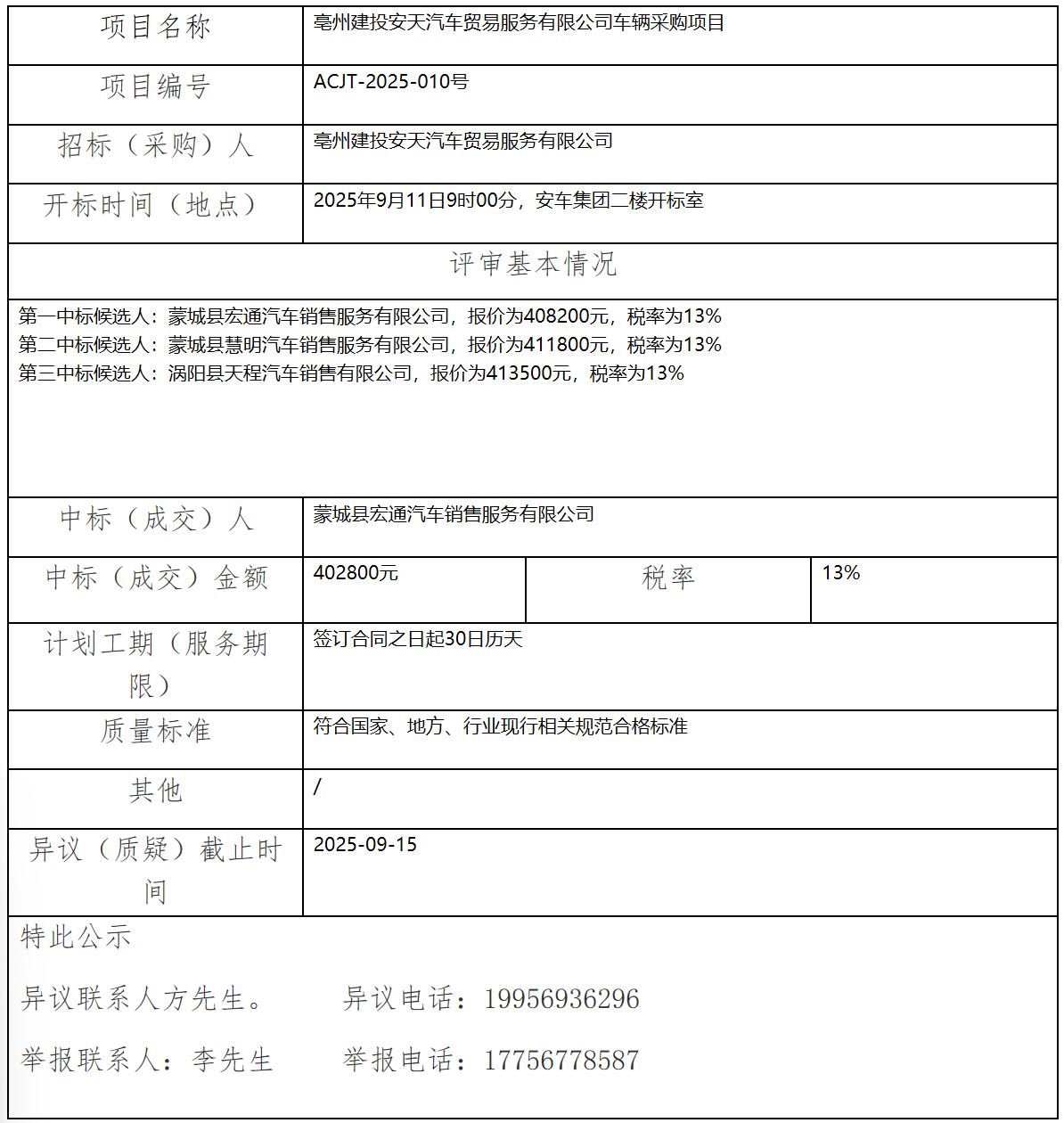 亳州建投安天汽車貿(mào)易服務(wù)有限公司車輛采購項目中標(biāo)(成交)結(jié)果公示