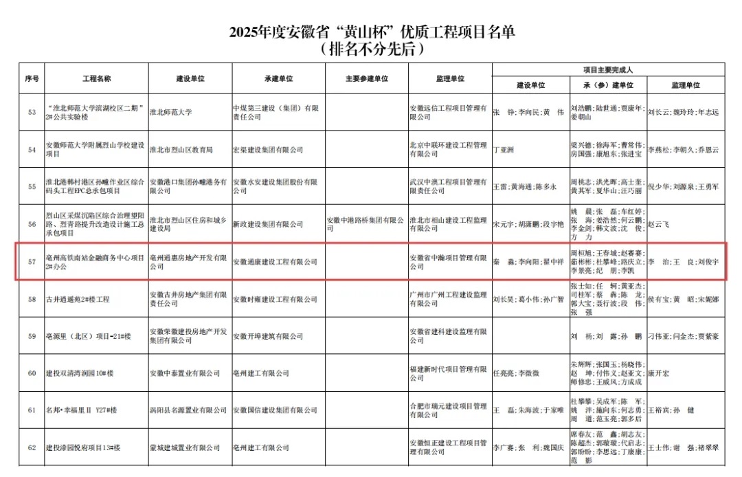 近日,安徽省住房和城鄉(xiāng)建設(shè)廳公示了2025年度安徽省建設(shè)工程“黃山杯”獎(省優(yōu)質(zhì)工程)項(xiàng)目名單,由通康公司承建的亳州高鐵南站商務(wù)中心項(xiàng)目2#樓成功榮獲2025年度安徽省建設(shè)工程“黃山杯”獎。