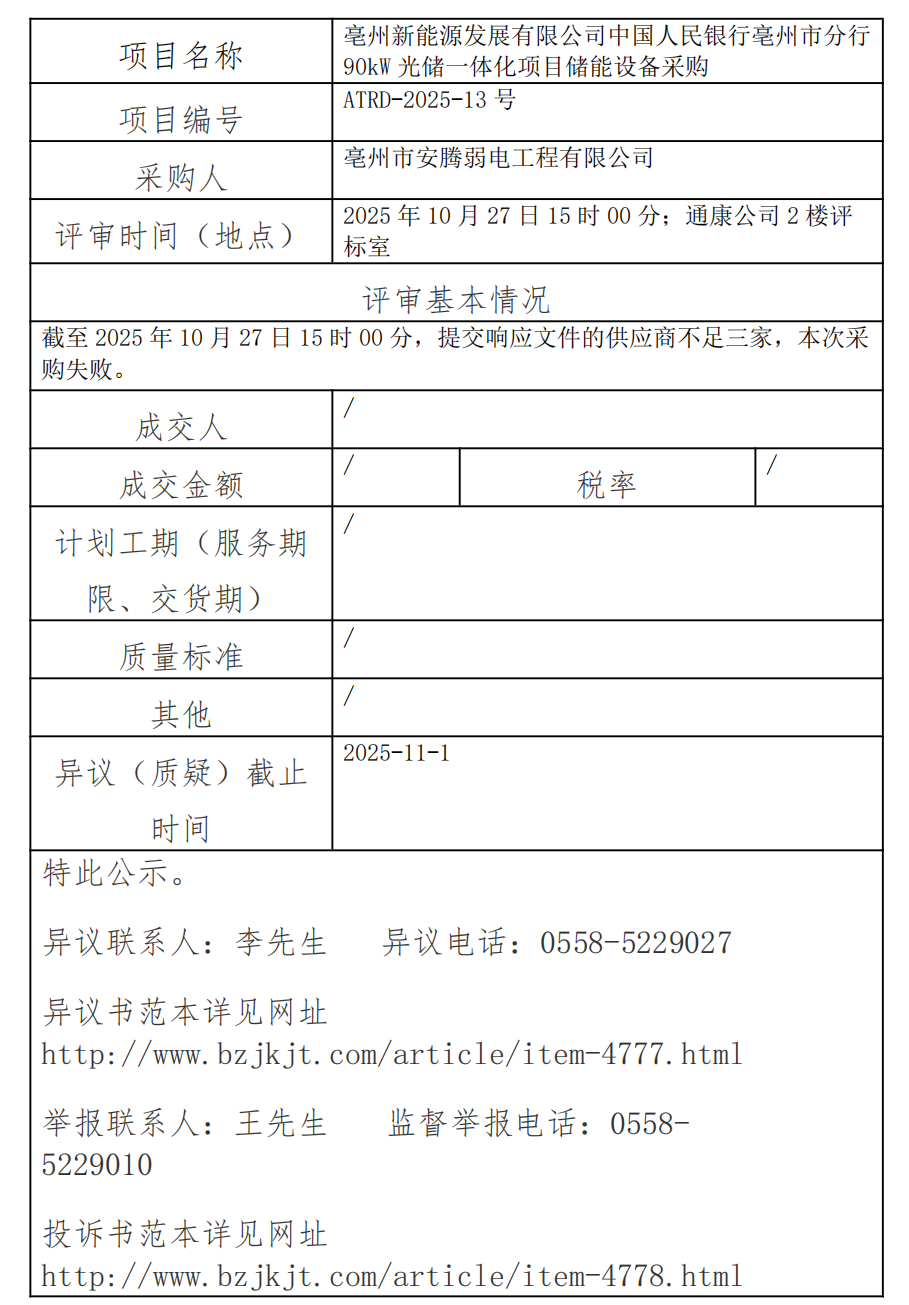 亳州新能源發(fā)展有限公司中國人民銀行亳州市分行90kw光儲一體化項目儲能設(shè)備采購成交結(jié)果公示