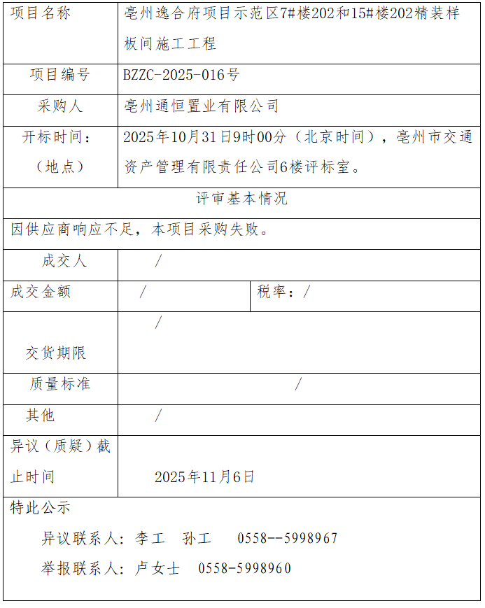 亳州逸合府項(xiàng)目示范區(qū)7#樓202和15#樓202精裝樣板間施工工程成交結(jié)果公示
