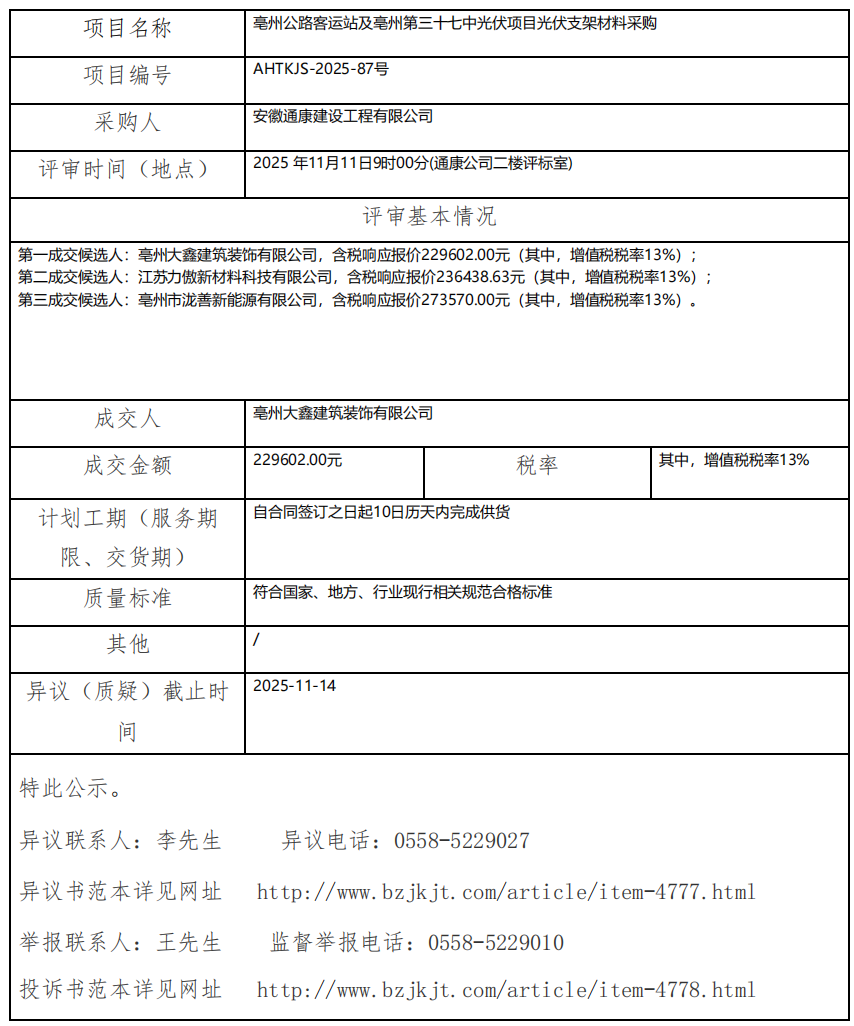亳州公路客運(yùn)站及亳州第三十七中光伏項(xiàng)目光伏支架材料采購成交結(jié)果公示