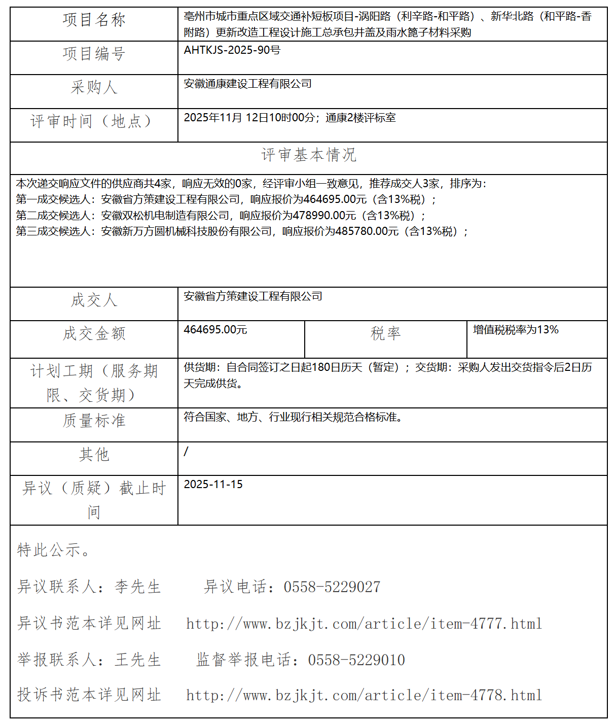 亳州市城市重點(diǎn)區(qū)域交通補(bǔ)短板項(xiàng)目-渦陽路(利辛路-和平路)、新華北路(和平路-香附路)更新改造工程設(shè)計(jì)施工總承包井蓋及雨水篦子材料采購成交結(jié)果公示