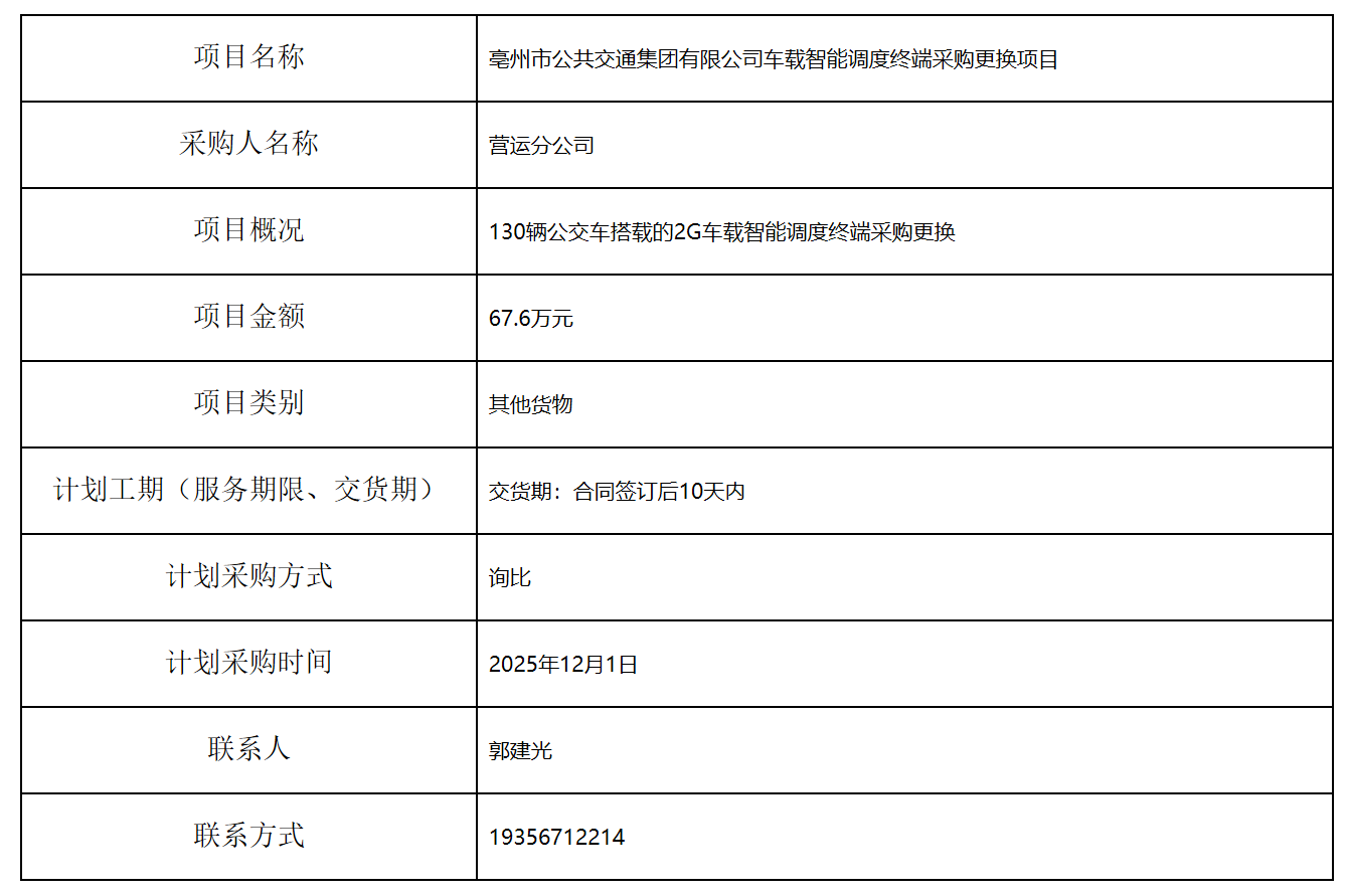 亳州市公共交通集團有限公司車載智能調(diào)度終端采購更換項目采購計劃