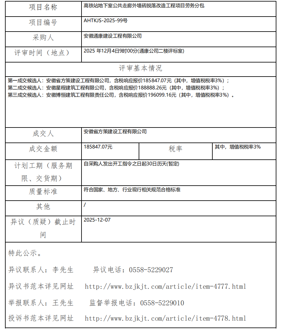 高鐵站地下室公共走廊外墻磚脫落改造工程項(xiàng)目勞務(wù)分包成交結(jié)果公示