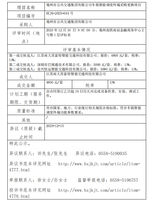 亳州市公共交通集團(tuán)有限公司車載智能調(diào)度終端采購更換項目成交結(jié)果公示