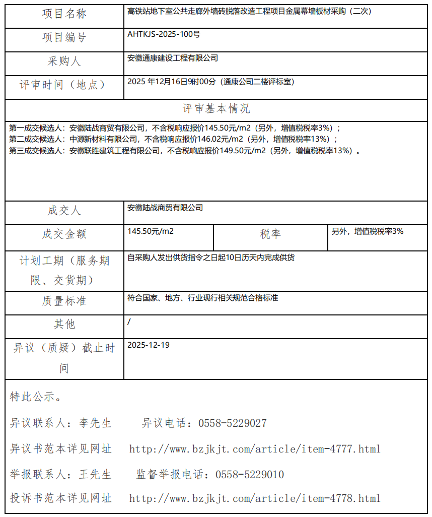 高鐵站地下室公共走廊外墻磚脫落改造工程項目金屬幕墻板材采購(二次)成交結(jié)果公示