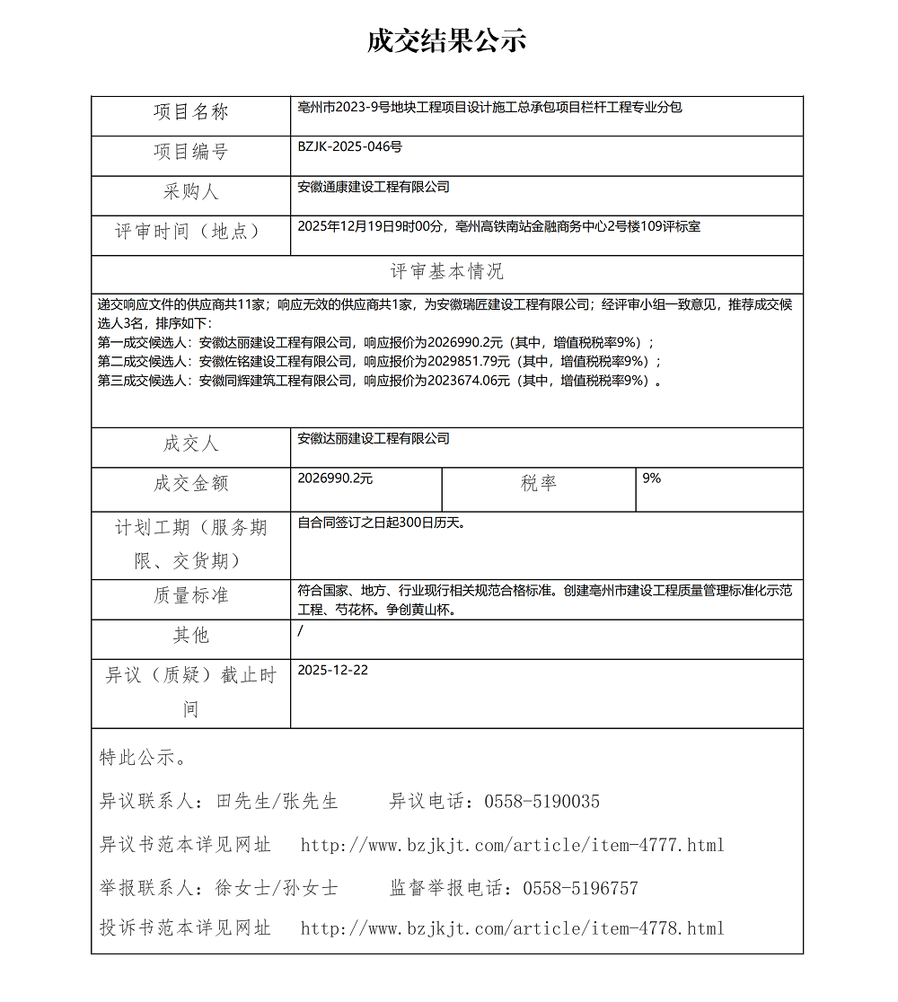 亳州市2023-9號地塊工程項目設計施工總承包項目欄桿工程專業(yè)分包成交結果公示