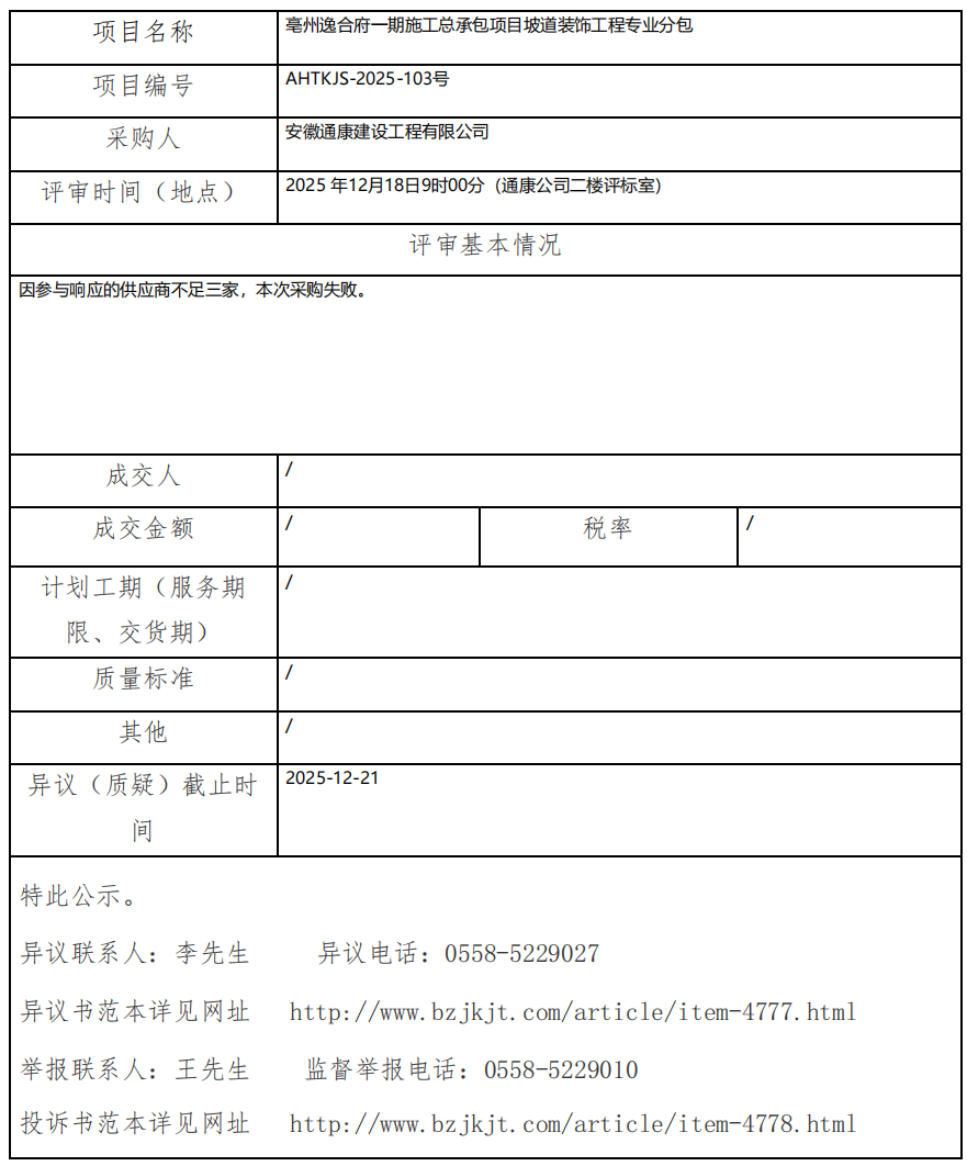 亳州逸合府一期施工總承包項(xiàng)目坡道裝飾工程專(zhuān)業(yè)分包成交結(jié)果公示