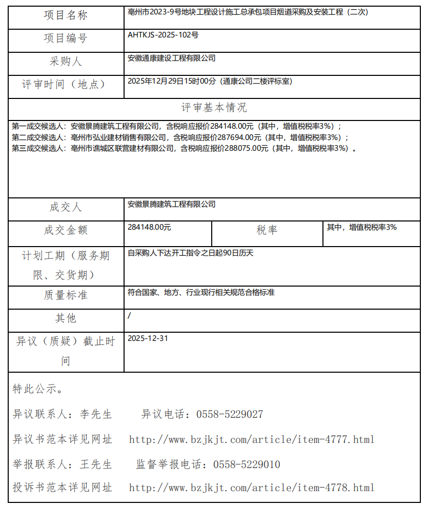 亳州市2023-9號地塊工程設(shè)計施工總承包項目煙道采購及安裝工程(二次)成交結(jié)果公示