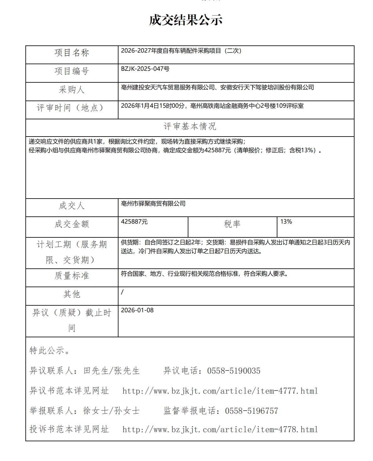 2026-2027年度自有車輛配件采購項(xiàng)目(二次)成交結(jié)果公示