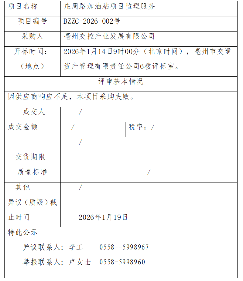 莊周路加油站項目監(jiān)理服務(wù)成交結(jié)果公示