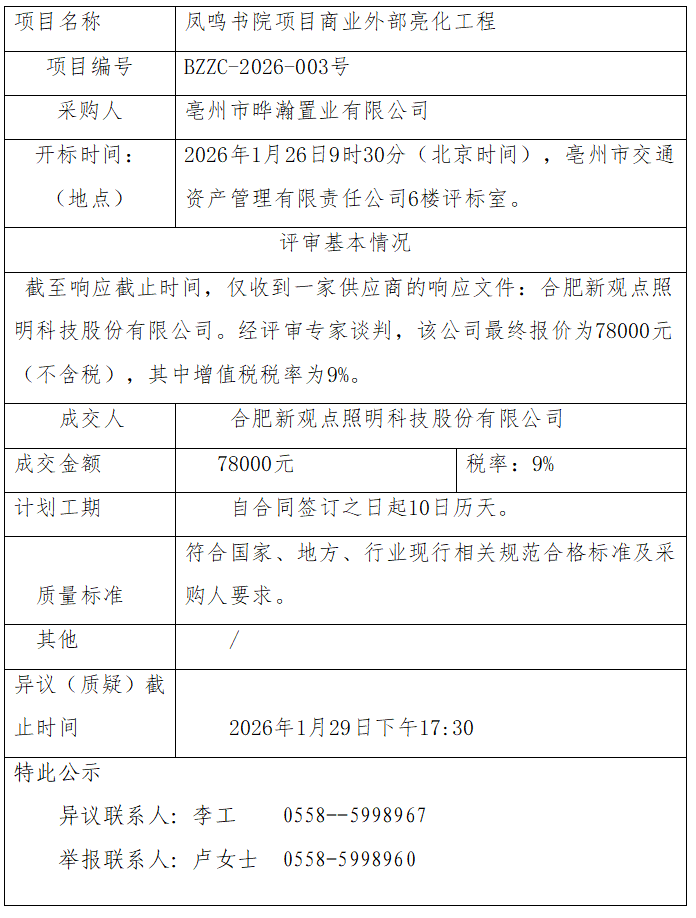 鳳鳴書院項目商業(yè)外部亮化工程成交結(jié)果公示