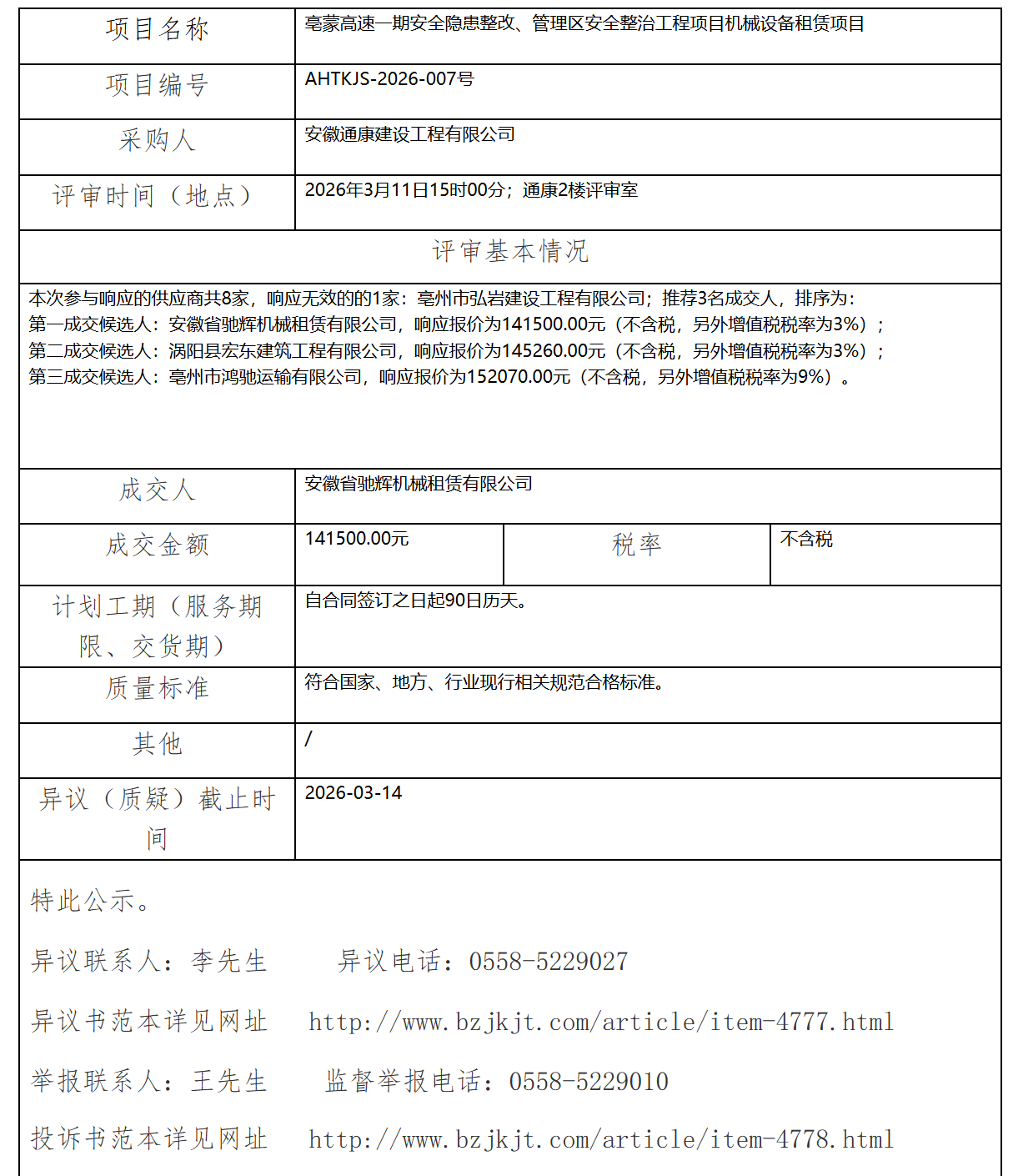 毫蒙高速一期安全隱患整改、管理區(qū)安全整治工程項目機械設備租賃項目成交結(jié)果公示