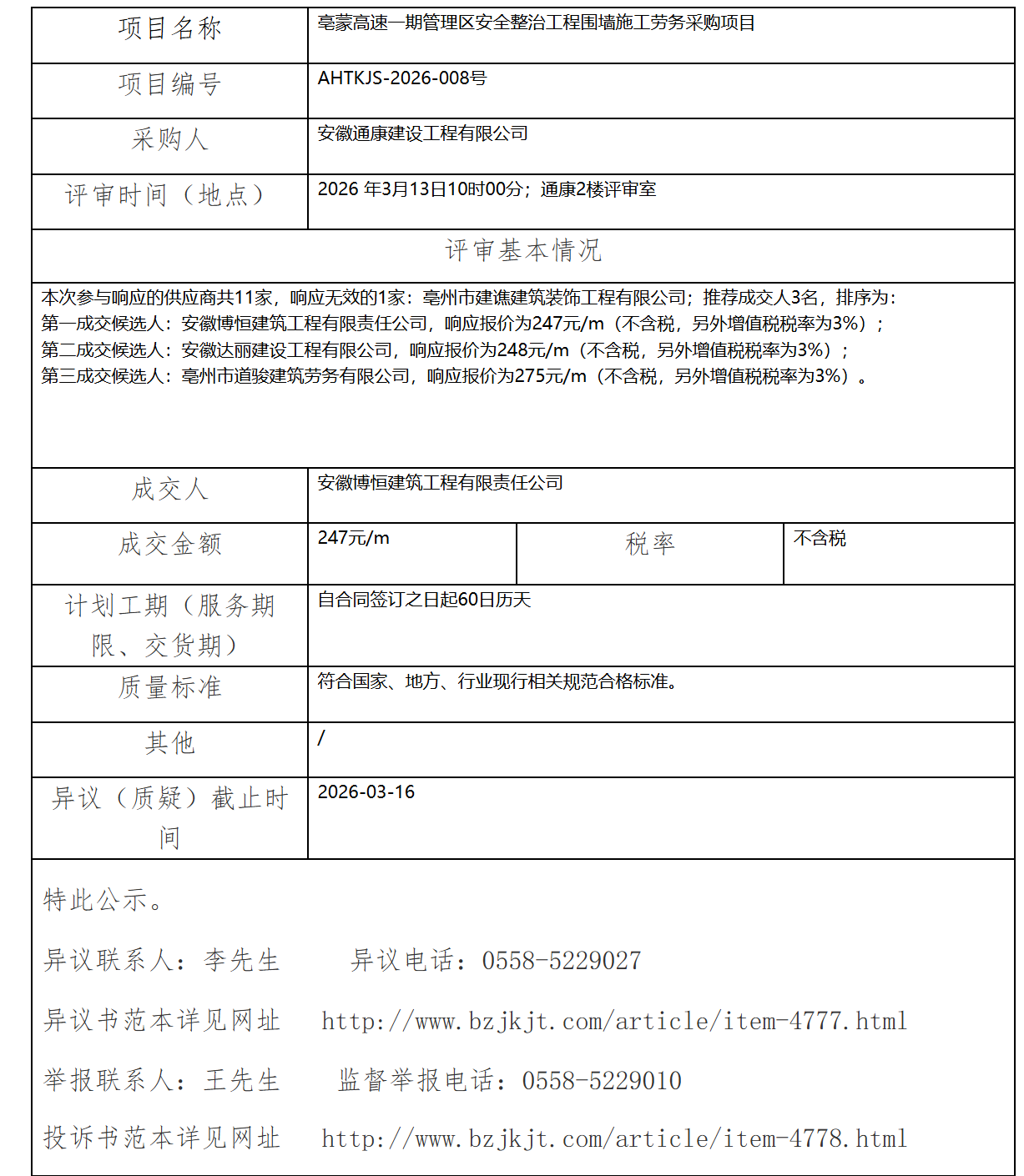 亳蒙高速一期管理區(qū)安全整治工程圍墻施工勞務(wù)采購(gòu)項(xiàng)目成交結(jié)果公示