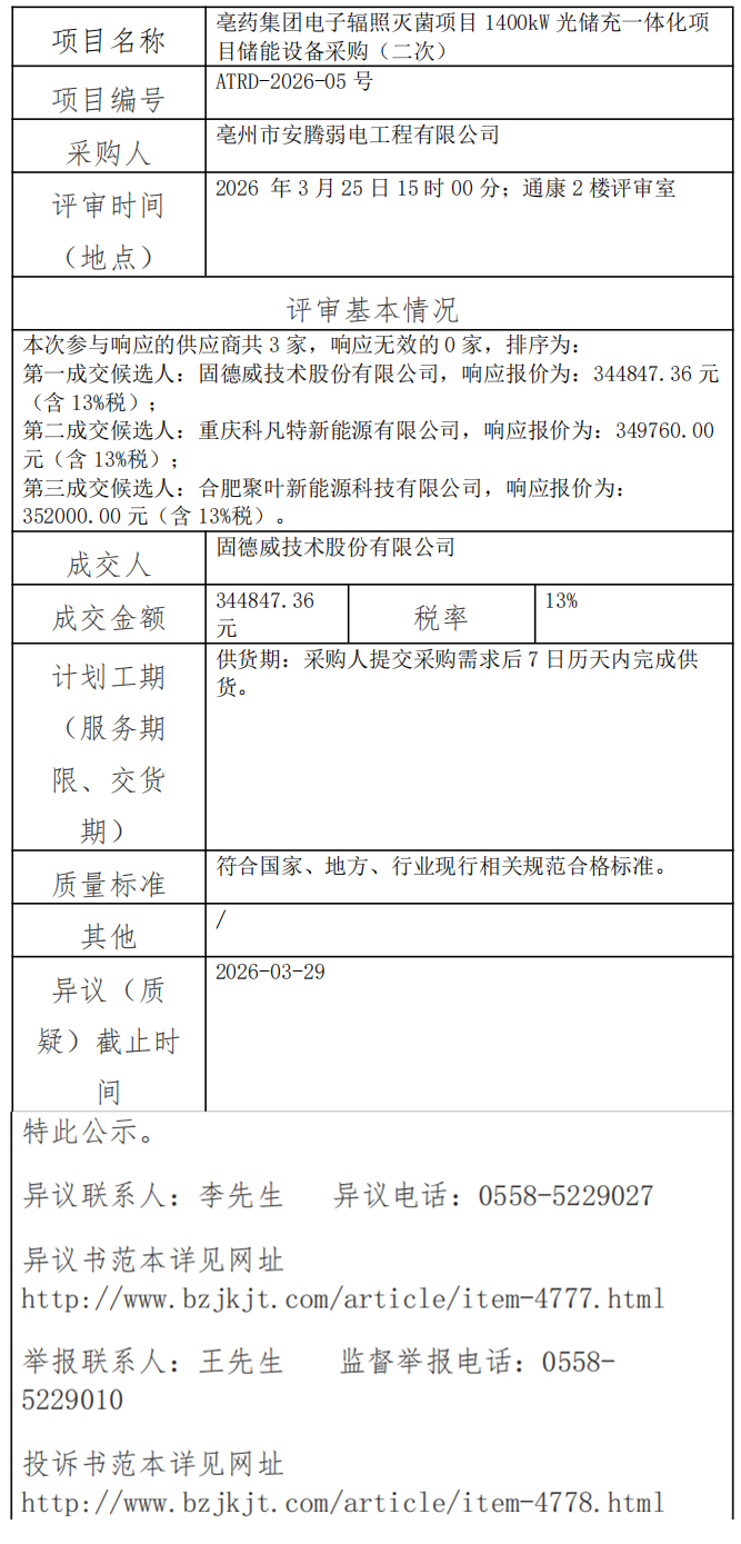 亳藥集團(tuán)電子輻照滅菌項目 1400kW 光儲充一體化項 目儲能設(shè)備采購(二次)成交結(jié)果公示