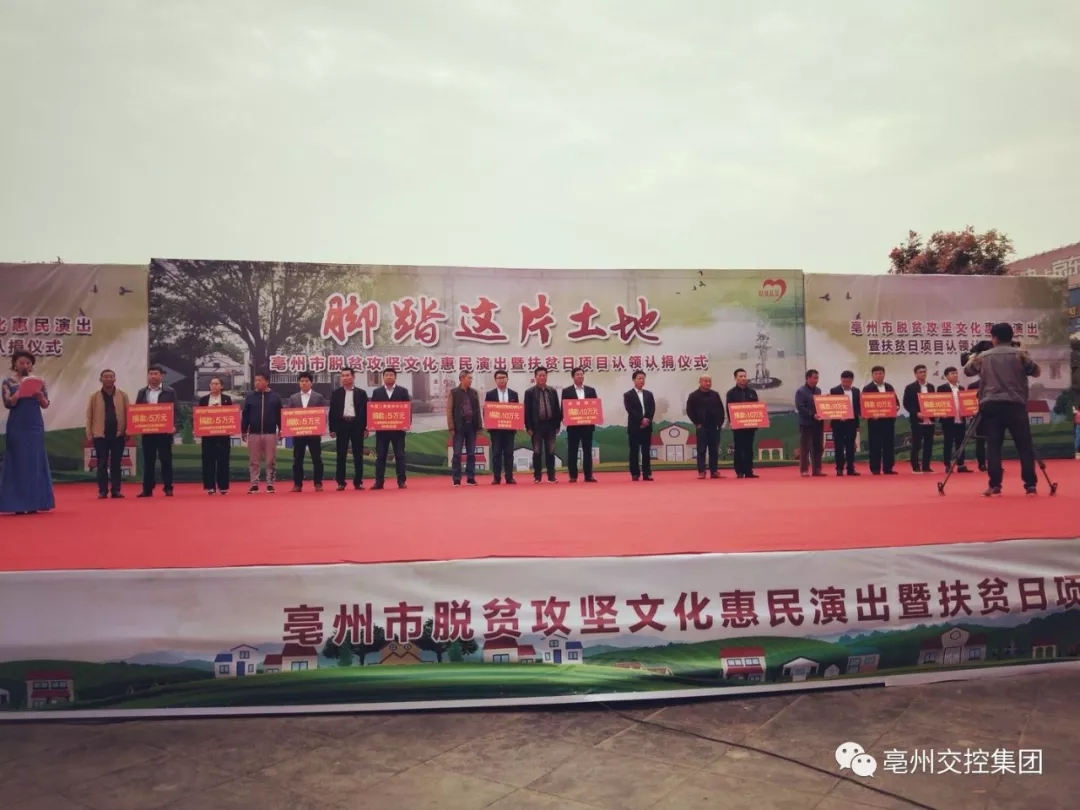 近日,由亳州市委組織部、市委宣傳部、市工商聯(lián)等聯(lián)合舉辦“腳踏這片土地”——亳州市脫貧攻堅(jiān)文化惠民演出暨扶貧日項(xiàng)目認(rèn)領(lǐng)認(rèn)捐活動在魏武廣場天幕劇場舉行。交控集團(tuán)現(xiàn)場舉牌認(rèn)領(lǐng)20萬元譙城區(qū)、利辛縣扶貧項(xiàng)目。