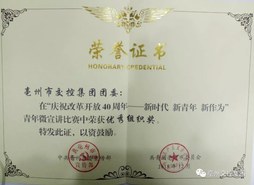 在“慶祝改革開放40周年”青年微宣講比賽活動(dòng)中,集團(tuán)高度重視、積極動(dòng)員、精心組織,于10月18日舉辦了內(nèi)部選拔賽,根據(jù)比賽結(jié)果,推薦公交公司孟雨、安車交通張浩、集團(tuán)本部高層層等5名選手參加市級(jí)比賽。集團(tuán)張浩在初賽、復(fù)賽、決賽中表現(xiàn)優(yōu)異,榮獲個(gè)人三等獎(jiǎng);集團(tuán)團(tuán)委在此次活動(dòng)中的組織工作也得到主辦方肯定,獲評(píng)中共亳州市委宣傳部、共青團(tuán)亳州市委員會(huì)聯(lián)合授予的10家“優(yōu)秀組織獎(jiǎng)”單位之一。